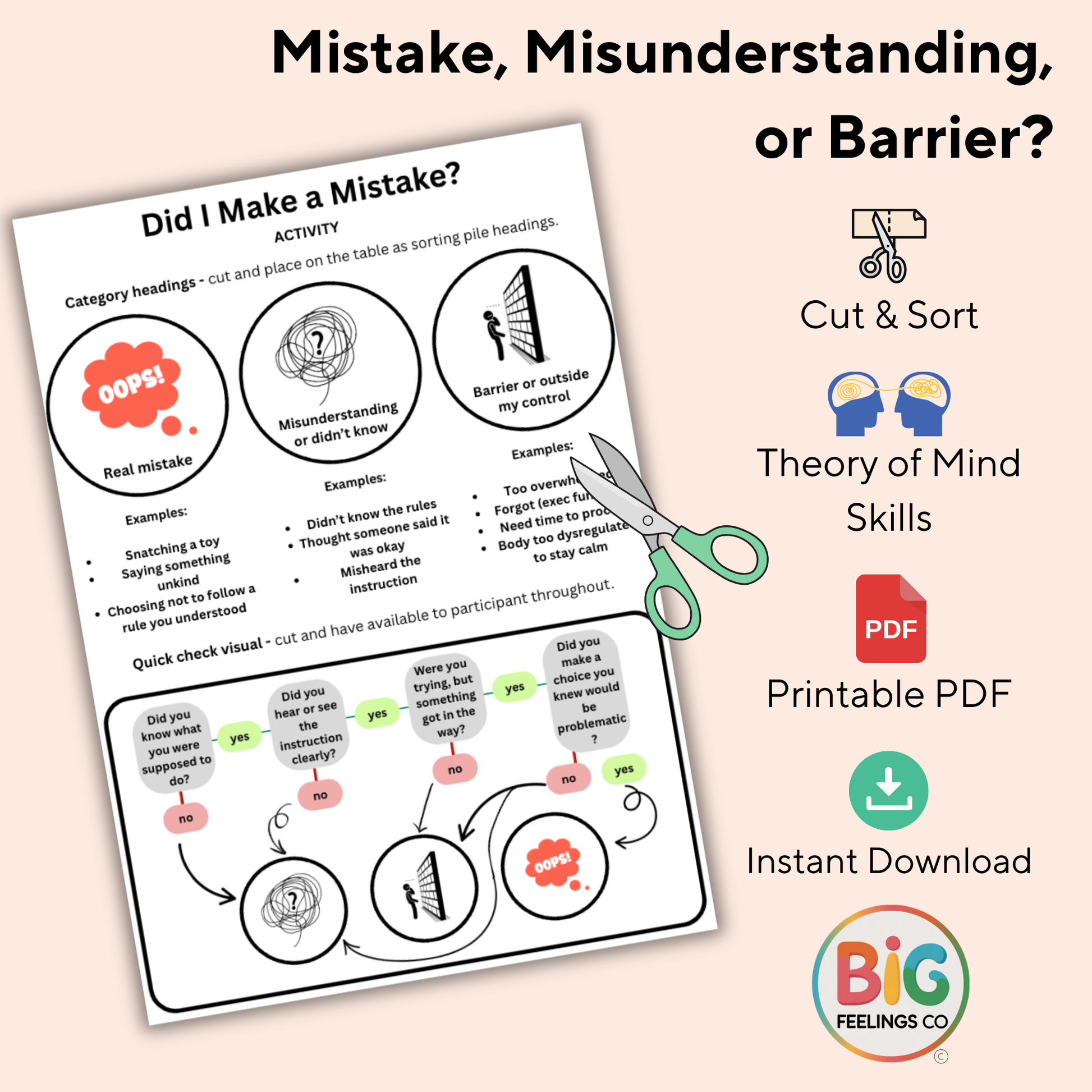 This activity guides children through a gentle process of figuring out whether something they did was actually a mistake - or if it just felt like one. Using visual prompts, sorting options, and reflective questions, it supports emotional regulation, self-compassion, and clearer thinking in moments of confusion or regret.