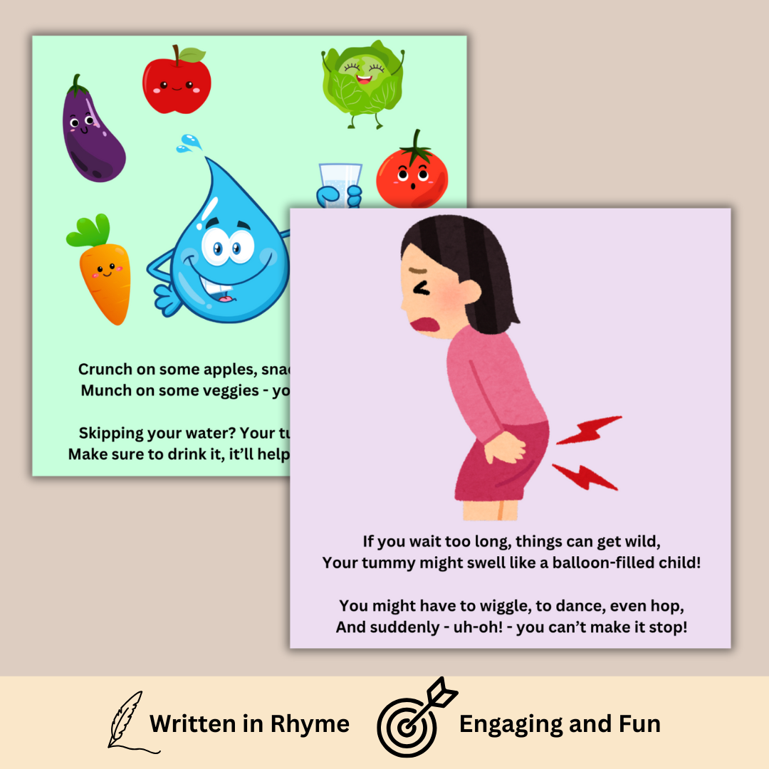 This social story helps kids understand why it’s important to listen to their body, how it feels when we hold on for too long, and what can happen when we let it go. Through gentle, reassuring language and relatable visuals, it teaches kids that going to the toilet is safe, helpful, and nothing to be afraid of.