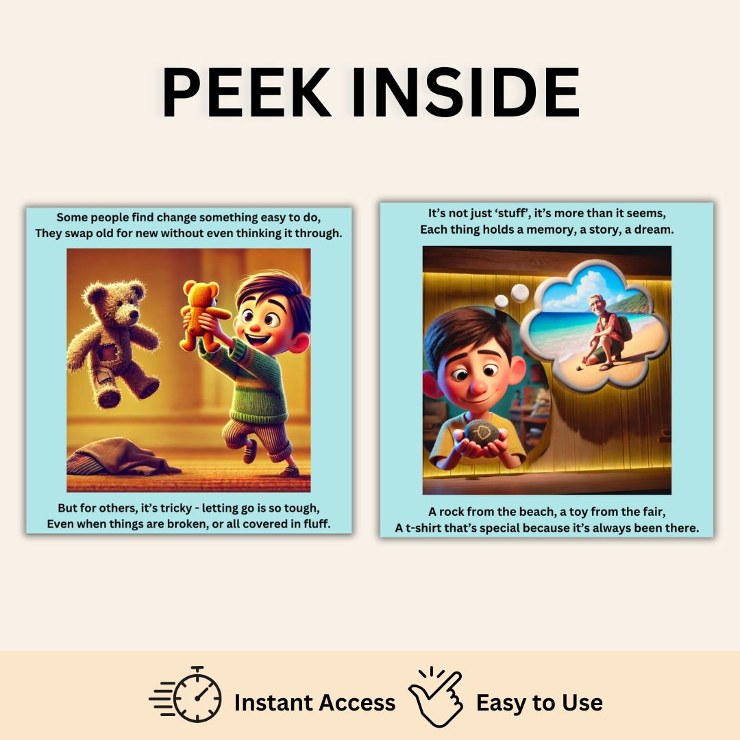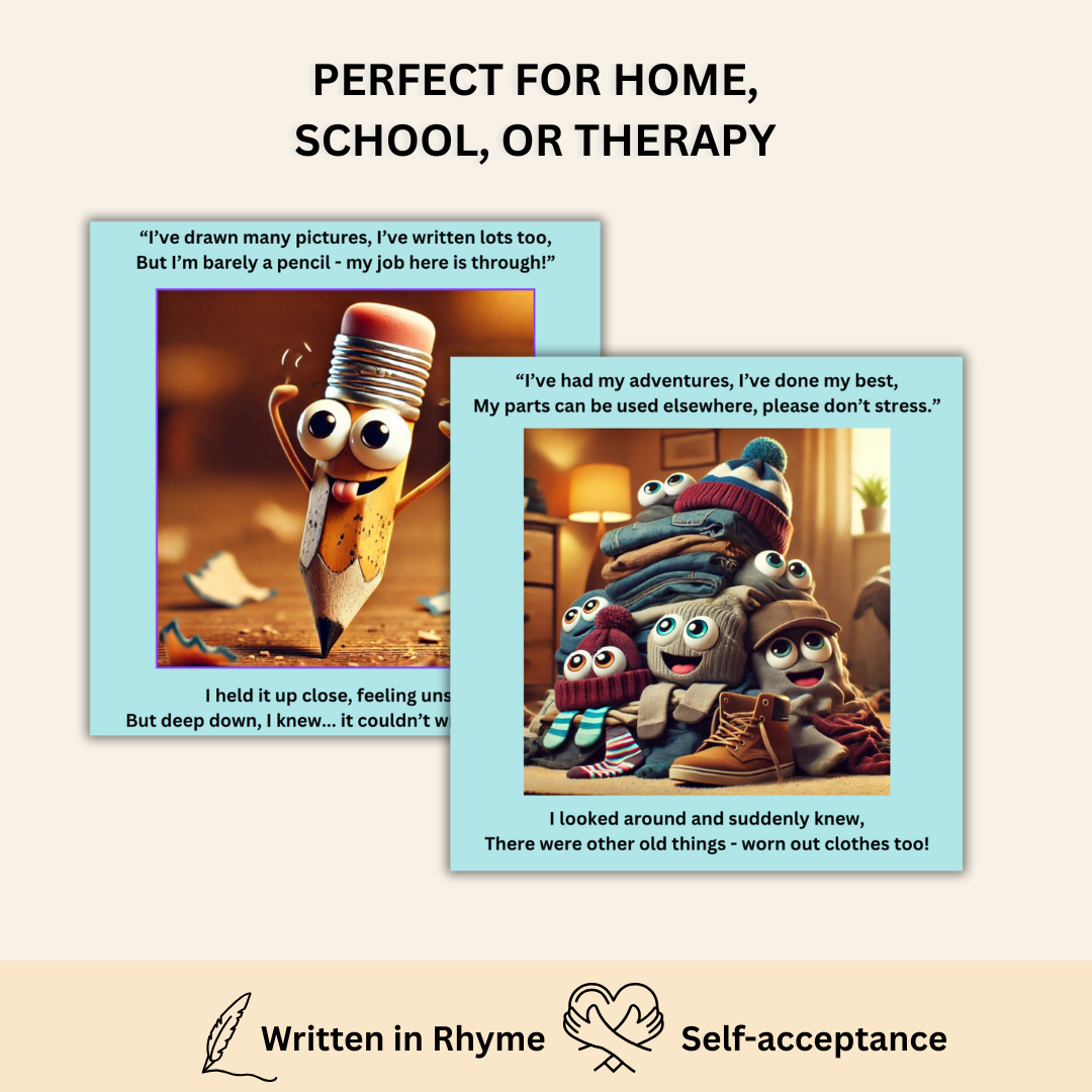 This social story gently helps children understand why we sometimes need to let go of the objects we’ve outgrown or worn out, and how doing so doesn’t erase the memories or the love they carried. It honours the emotional connection, while introducing safe, supportive ways to say goodbye.