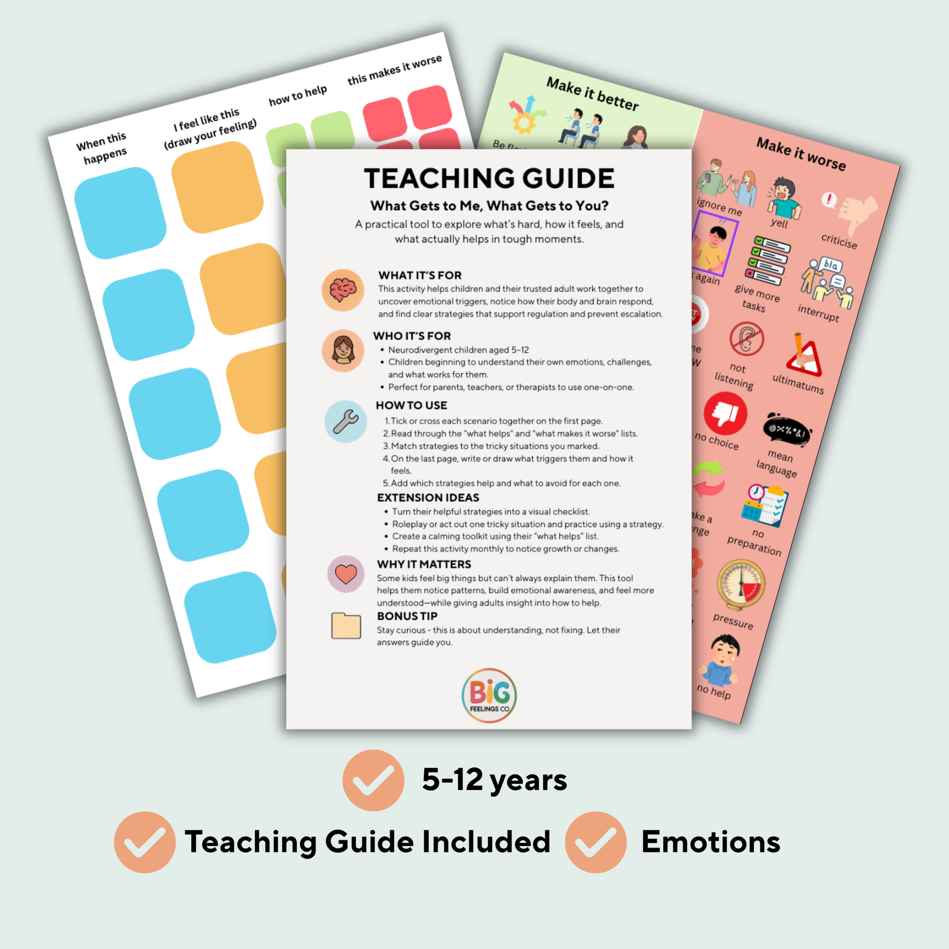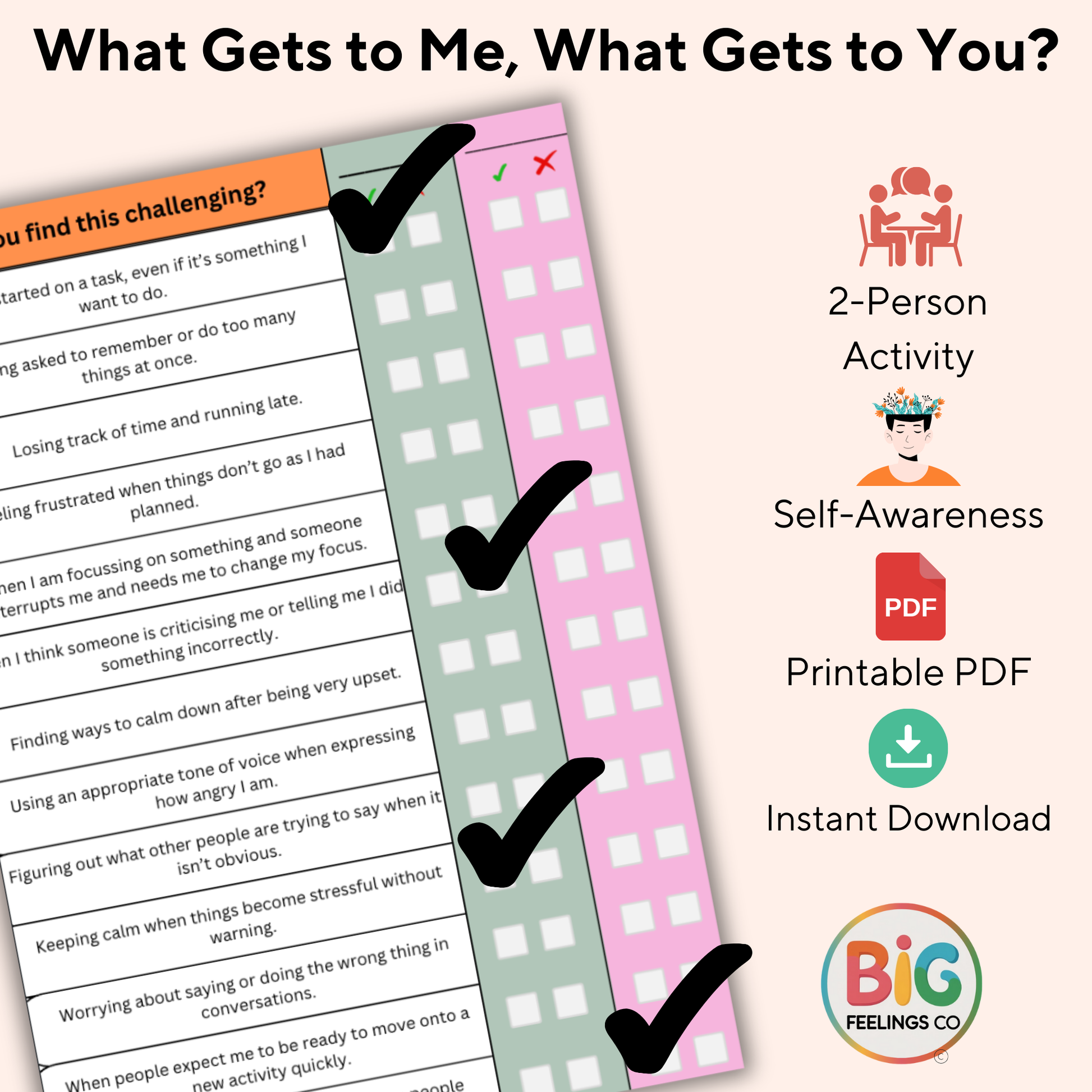 This collaborative activity invites two people—siblings, peers, parent and child, student and support worker—to reflect on what triggers their emotional or behavioural challenges. Together, they compare what sets them off, what helps, and what doesn’t—building empathy, self-awareness, and co-regulation skills along the way.